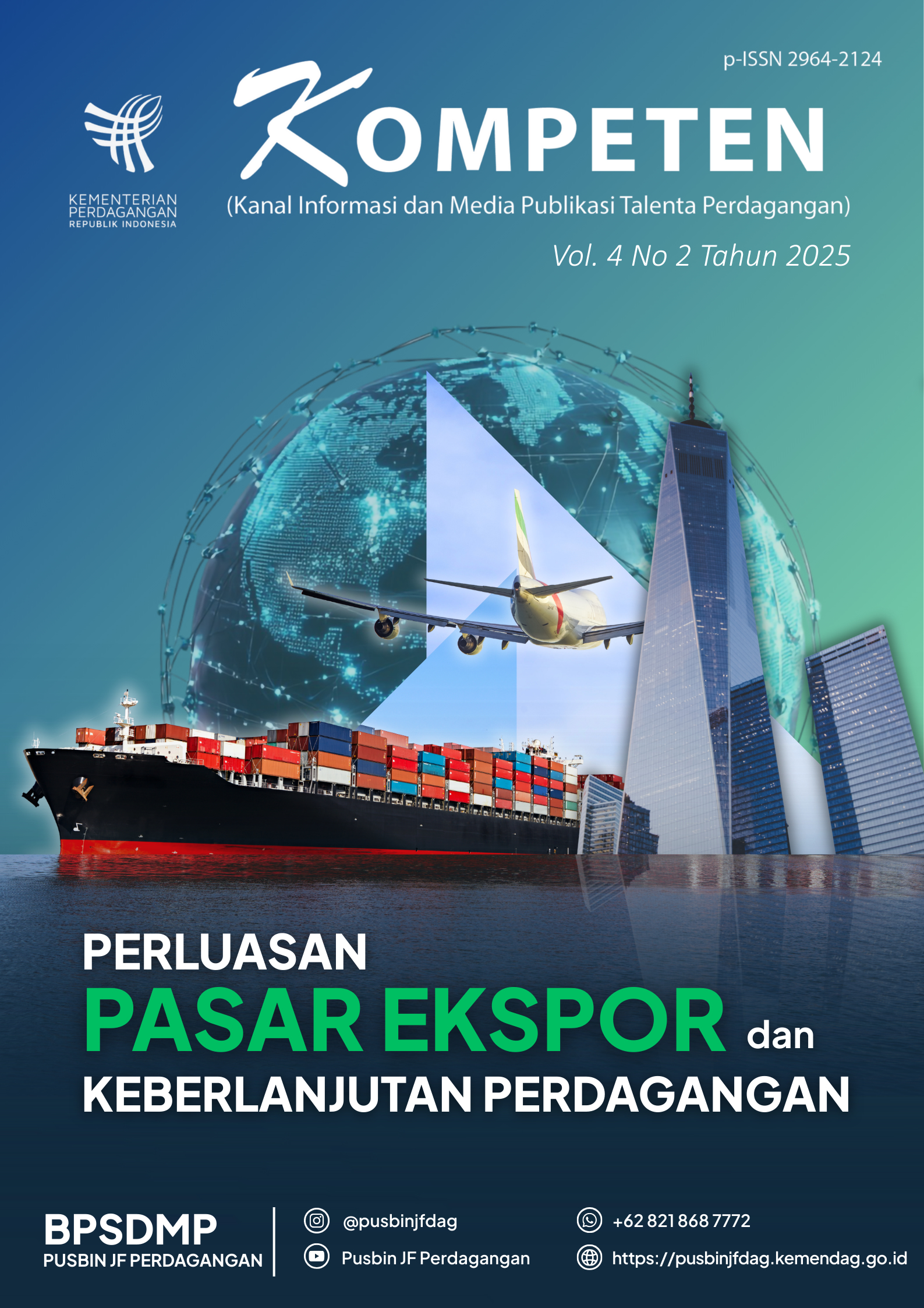 Halo Sobat Perdagangan, Pada edisi kali ini, Majalah KOMPETEN mengangkat tema Perluasan Pasar Ekspor dan Keberlanjutan Perdagangan. Perluasan pasar ekspor menjadi langkah strategis dalam mendorong pertumbuhan ekonomi nasional sekaligus memperkuat daya saing produk Indonesia di pasar global. Di tengah dinamika perdagangan internasional yang semakin kompleks, upaya membuka pasar baru perlu dibarengi dengan komitmen terhadap praktik perdagangan yang berkelanjutan dan bertanggung jawab. Melalui kebijakan yang adaptif, peningkatan kualitas produk, serta penguatan kompetensi sumber daya manusia, perluasan ekspor diharapkan tidak hanya meningkatkan nilai perdagangan, tetapi juga memberikan dampak positif bagi pelaku usaha, masyarakat, dan lingkungan. Keberlanjutan perdagangan menjadi fondasi penting agar pertumbuhan ekspor dapat berlangsung secara inklusif dan berkesinambungan. Dalam edisi ini, Majalah KOMPETEN menyajikan beragam tulisan, gagasan, dan pengalaman dari para insan perdagangan yang mengulas strategi, tantangan, serta peluang dalam memperluas pasar ekspor Indonesia. Berbagai perspektif tersebut diharapkan dapat menjadi referensi, inspirasi, dan penguatan wawasan bagi seluruh pemangku kepentingan di bidang perdagangan.